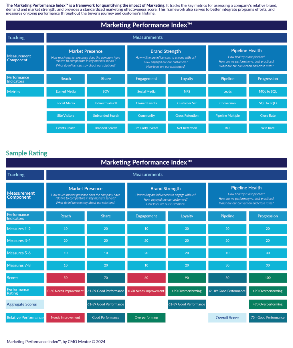 In my previous eight blogs on the Marketing Performance Index (MPI), I explained why I created the MPI, how it’s constructed, how it works, and how easy it is to create your own benchmark in about an hour. I’ve also shared the definitions for the 24 key metrics it tracks across the three main areas of Market Presence, Brand Strength and Pipeline Health, and provided tips and techniques to improve performance in areas where any particular score is below industry benchmarks and/or target results.
