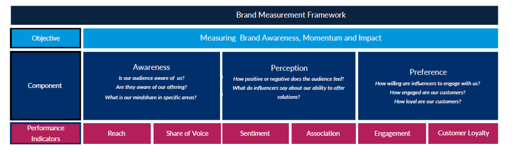 While CMO of Emburse from 2019 to 2022, I created a brand measurement framework, with help from Forrester, to track the impact of brand on demand, pipeline and bookings. This framework is shown below and it is fairly straightforward to implement at almost any B2B company. There are three broad areas to measure: awareness, perception and preference. And the six indicators along with key metrics associated with these measurement areas are: reach, share of voice, sentiment, association, engagement and loyalty.